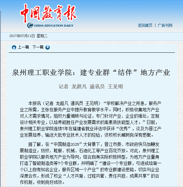 【中国教育报】泉州理工职业学院:建专业群“结伴”地方产业