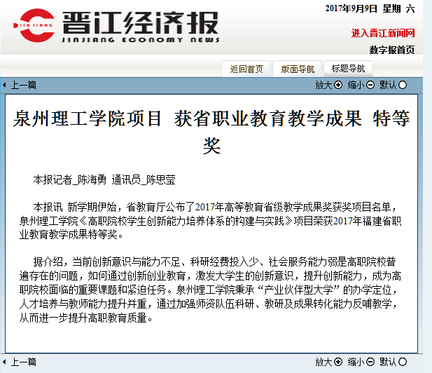 【晋江经济报】泉州理工学院项目获省职业教育教学成果特等奖