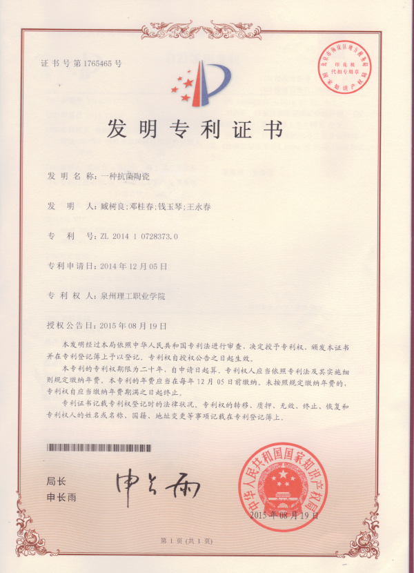 经过国家知识产权局专利局初步审查、公布,实质审查、书面专家答辩、公告等五个流程的查阅审核,我校“一种抗菌陶瓷”获得国家知识产权局国家发明专利授权,授权专利号:ZL2014 10728373.0,这是我校科技创新又一成果...