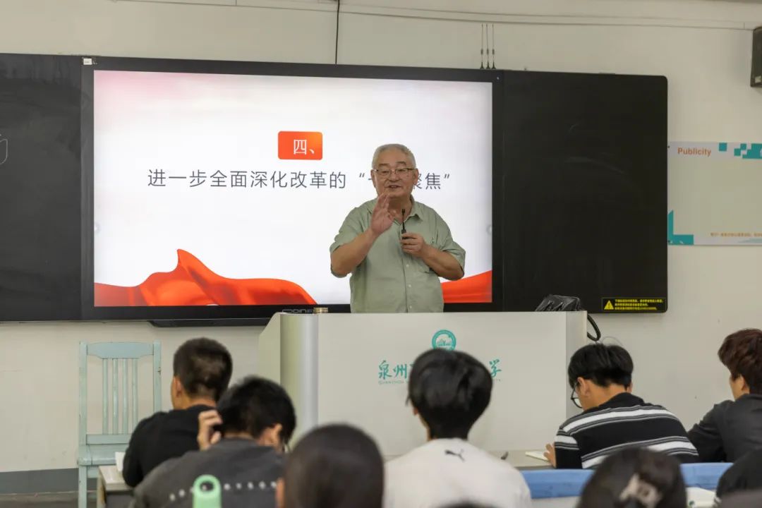 10月29日下午,阳光洒在泉大校园,一位银发教授正在A202教室为同学们带来一堂激动人心的思政课。这位老教授是我校校务顾问、马克思主义学院来永宝,课堂上,他与同学们深入学习了习近平总书记在福建考察时的重要讲话精神,让同学们备受鼓舞。10月15日至16日,习近平总书记先后来到福建漳州、厦门等地,深入乡村、红色教育基地、文物保护单位、自由贸易试验区等考察调研。习近平强调,福建要深入贯彻党的二十大和二十届三中全会...