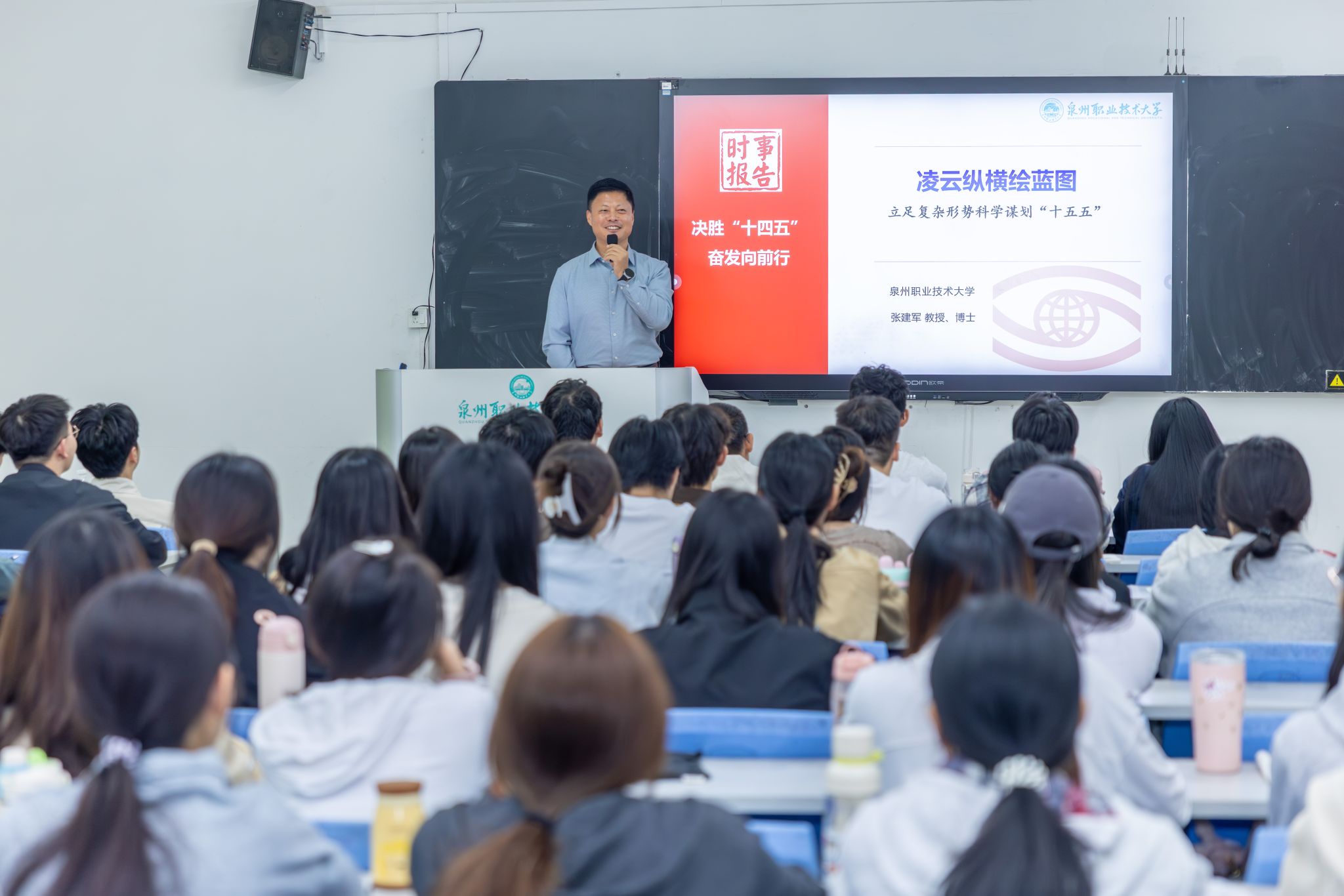 金秋十月,硕果累累,学校副校长张建军教授带来了一堂别来生面的思政课。10月21日下午,张建军为2024级大数据与会计(专升本)1和2班同学开讲,他讲授的专题是:凌云纵横绘蓝图——立足复杂形势,科学谋划“十五五”。他结合即将召开的党的二十届四中全会确定的发展方略,讲授“十五五”国家发展怎么看——看清发展大势、“十五五”职业教育怎么看——看清职业形势、“十五五”学校建设怎么看——看清成长趋势等三个方面内容。...