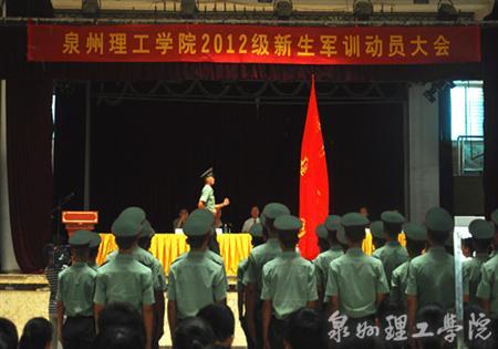 9月 10日,泉州理工学院 2012级新生军训动员大会在三楼大礼堂举行。1700多名新生将开始为期一周的军训生活。 伴着铿锵有力的军歌,校长苏志明代表学校向承担本次军训任务的 73141部队教官...