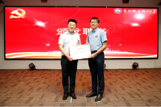 庄文瑞副校长宣读《关于成立泉州职业技术大学马克思主义学院的通知》文件, 经学校党委研究,决定在思政教研部基础上成立马克思主义学院,聘请钟君为马克思主义学院名誉院长,特聘刘小新为马克思主义学院专家组组长,特聘王福民为马克思主义学院专家,聘任林其天为马克思主义学院院长、林文艺和陈静为马克思主义学院副院长。