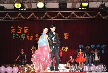 20日晚,由院学生会主办的第三届环保服装设计大赛在思恩楼三楼大礼堂举行。此次环保服装的材料包括塑料带、报纸、蚊帐、横幅等废品,突出了环保的概念,不同的设计风格展现了选手不同的创意。晚装PARTY、魔幻国度、异国风情,让人目不暇接。模特与作品设计者富有个性的走台秀,引得了观众掌声、欢呼声不断。