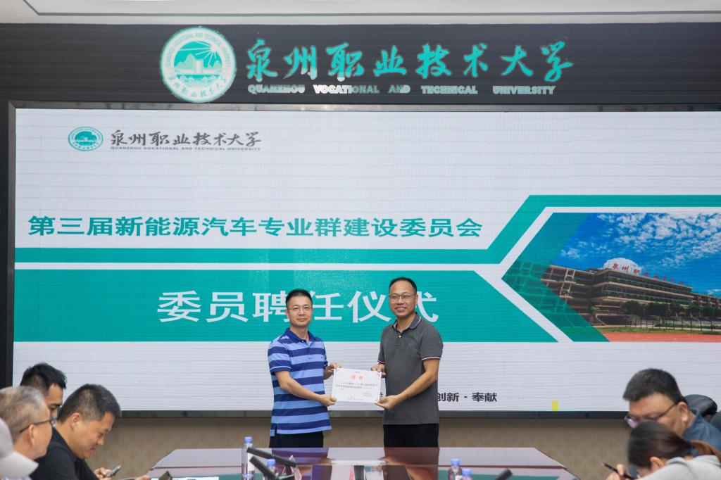 随后进行本次会议的第一项议程,为新聘任的新能源汽车专业群建设委员会主任、副主任以及委员颁发聘任书。