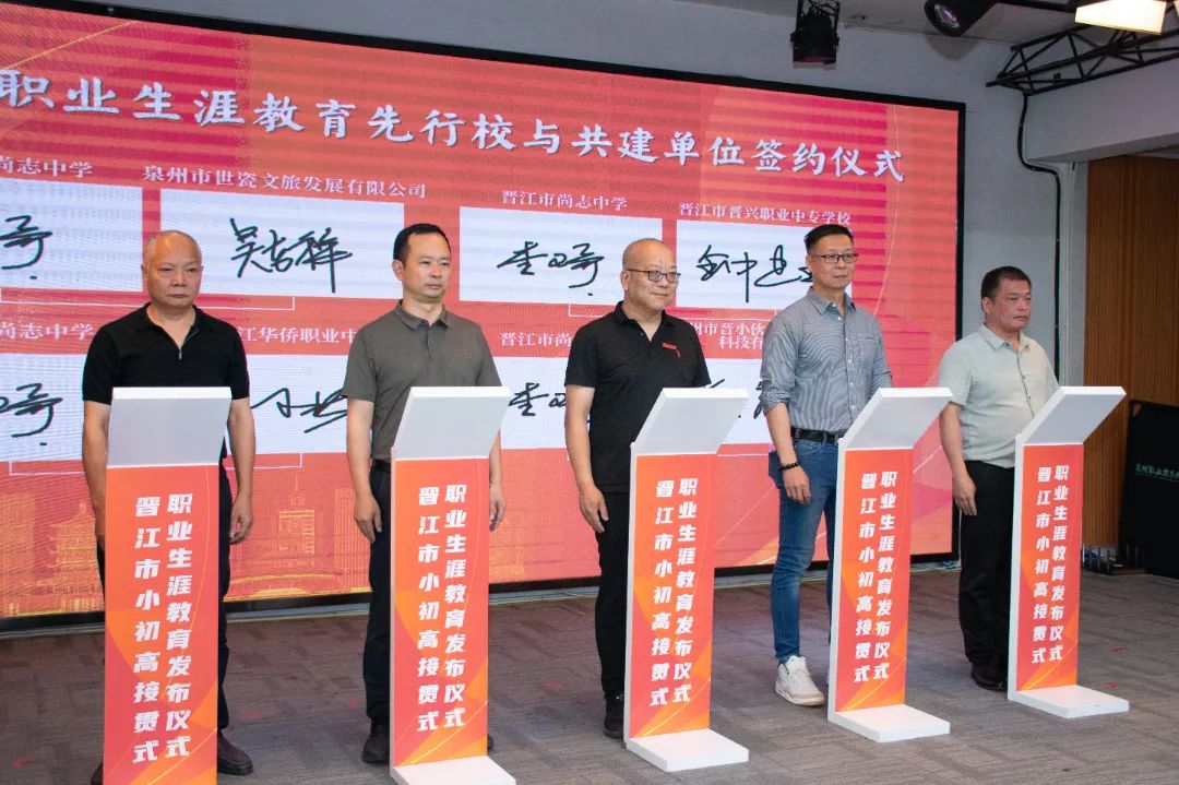 会上举行晋江市职业生涯教育先行校与共建单位的签约仪式。晋江市第二实验小学、晋江市首峰中学、泉州五中桥南校区、福建省晋江华侨职业中专学校等13所先行校与泉州职业技术大学、安踏(中国)有限公司、福建盼盼食品有限公司、福建恒安集团有限公司、福建省晋江华侨职业中专学校、晋江市晋兴职业中专学校等共建单位将携手并进,开展跨界融合,为职业生涯教育注入强劲动能,让教育从“单向输出”转向“共生共创”。