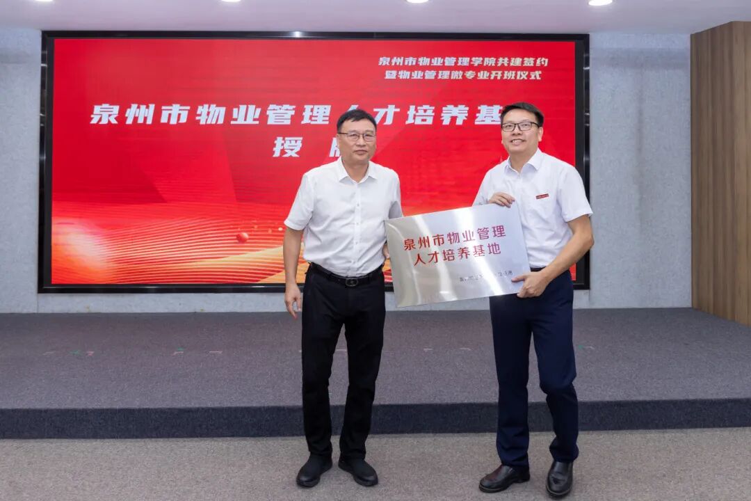 泉州市物业管理协会会长郭志铭、泉州职业技术大学人居环境学院执行院长吴铭辉签署行业人才培养协议。