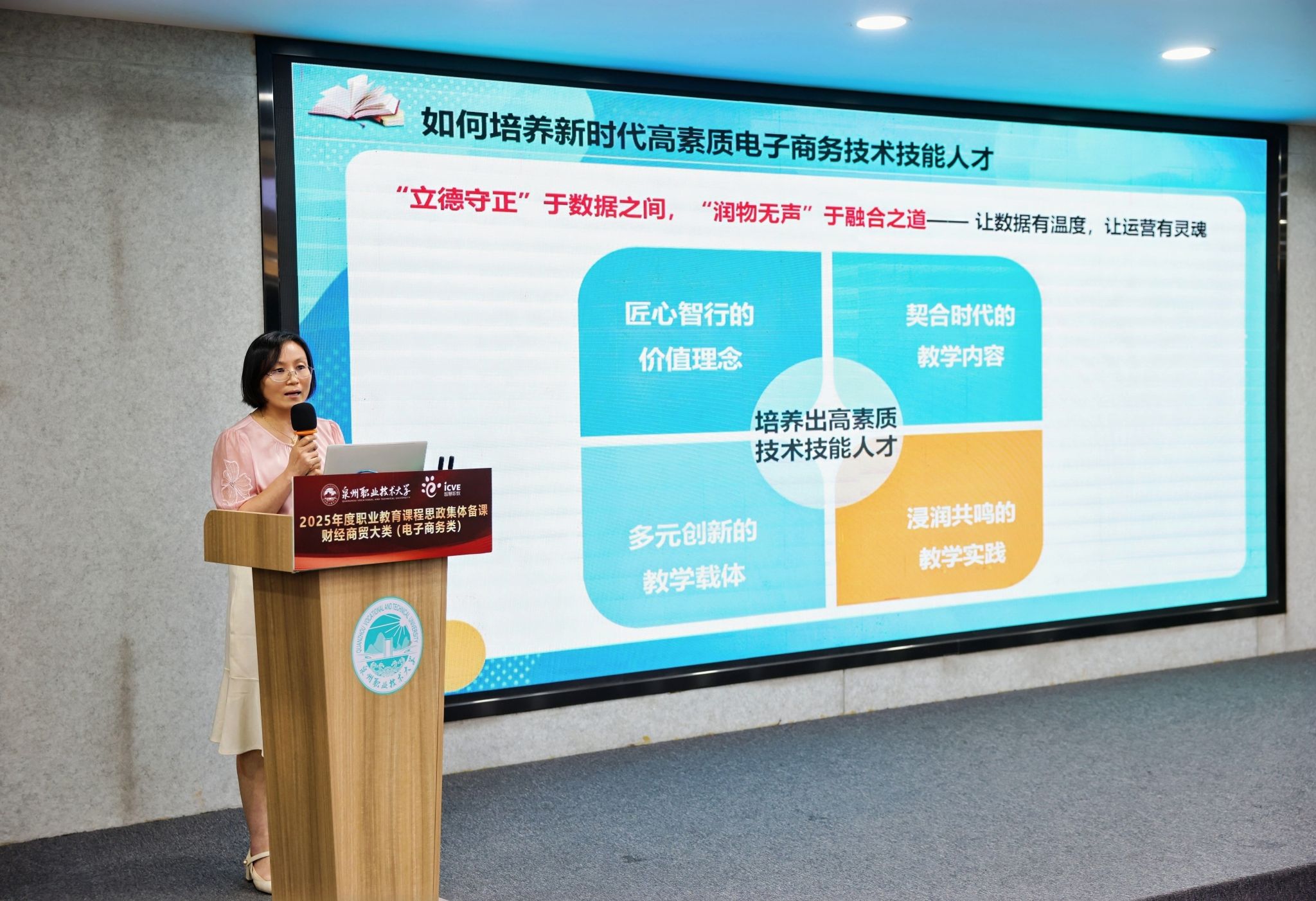 以“立德守正 融合赋能”为主题的2025年首场电子商务类专业课程思政集体备课活动,于10月20日在泉州晋江成功举办。本次活动由全国电子商务职业教育教学指导委员会(下称“全国电商行指委”)、全国供销合作职业教育教学指导委员会(下称“全国供销行指委”)联合主办,泉州职业技术大学承办。全国电商行指委常务副主任陆春阳,全国供销行指委副主任劳赐铭,泉州职业技术大学校长吴滨如出席活动并致辞。泉州职业技术大学副校长张建军主持活动。