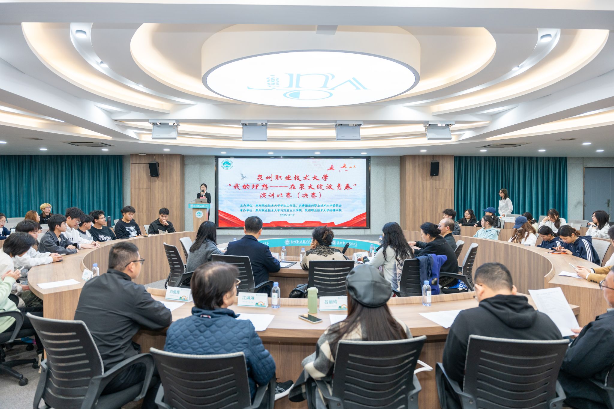 12月17日,泉州职业技术大学“我的理想——在泉大绽放青春”演讲比赛决赛于A301会议室举行。比赛旨在落实“大思政”育人理念,引导学生将个人理想融入学校发展与时代洪流,吸引了众多2025级新生积极参与。