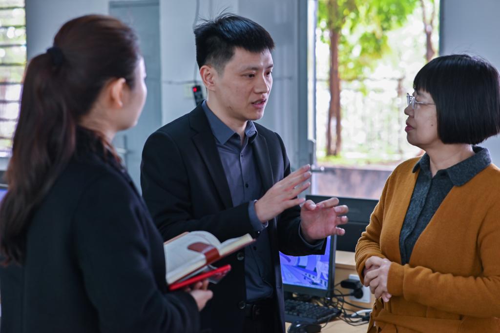▲ 郑伟清与同事探讨教学方法