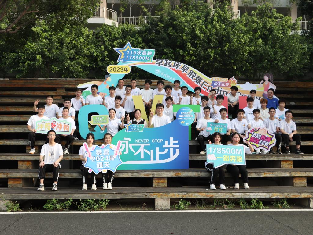 ▲ 邱宁博(第二排左一)参加最后一次早锻炼