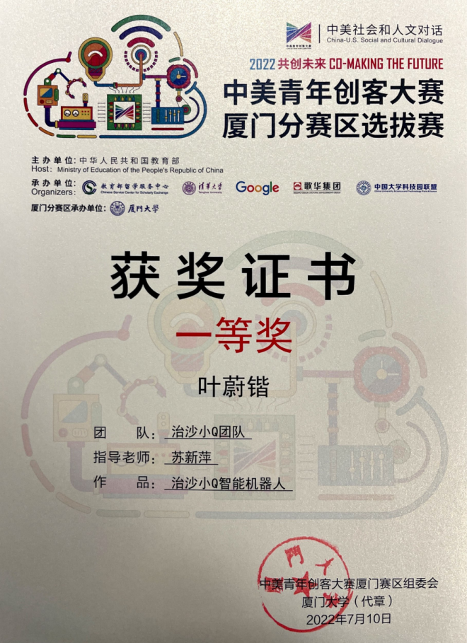 课堂之外,他积极参与各类技能竞赛。学业辅导员苏新萍介绍,叶蔚锴积极与上一届学长学姐组队,经常参加中国“互联网+”大学生创新创业大赛、中美青年创客大赛、“挑战杯”福建省大学生创业计划竞赛等竞赛。其中,在经过创客48小时马拉松后,他与团队共同制作的“治沙小Q智能机器人”,在2022年中美青年创客大赛成功拿下一等奖;在第十二届“挑战杯”福建省大学生创业计划竞赛(职业院校组)中,他们共同制作的“治沙小Q智能草方格铺设机器人”还摘得银奖。同时,他们的参赛项目还获得1项发明专利、1项实用新型专利,并获大学生创新创业训练计划省级立项并结题。